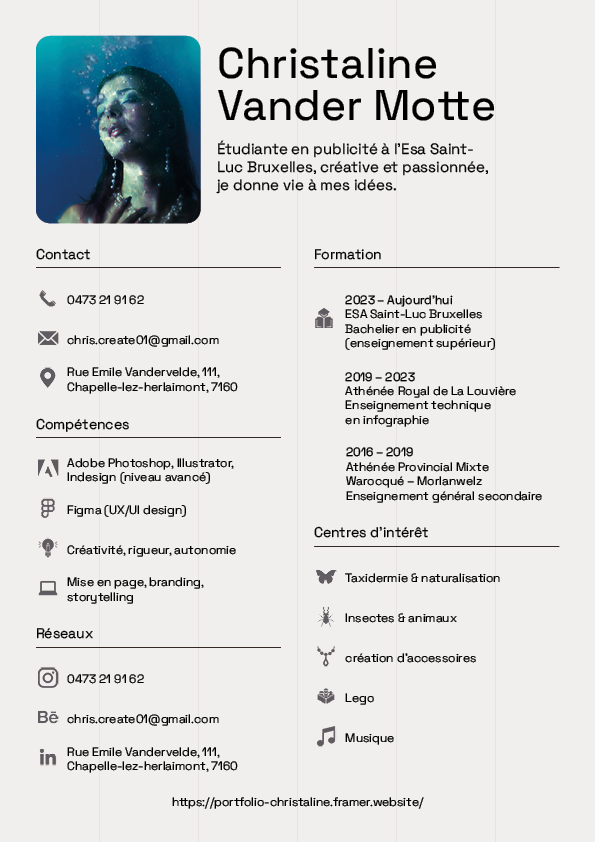 Second-year advertising student at ESA Saint-Luc Brussels with four years of graphic design experience. Eager to apply my creativity and skills to new projects.