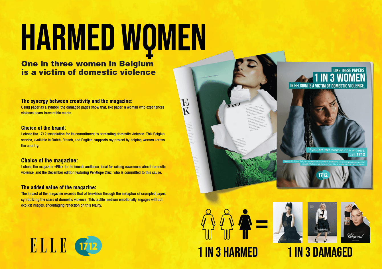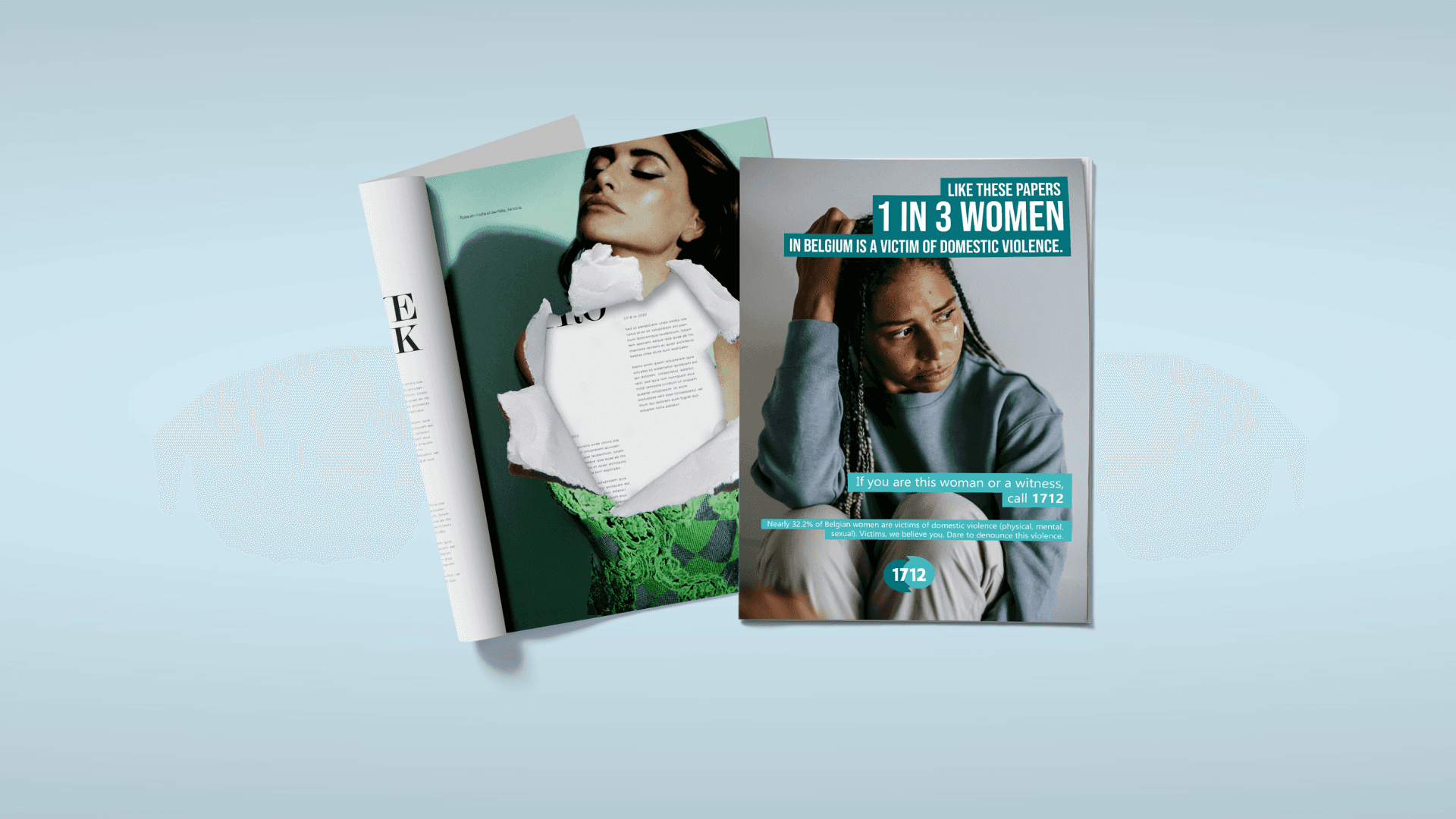 Tear one page out of three. Using paper as a symbol, the damaged pages illustrate that, just like paper, a woman who experiences violence bears irreversible marks.